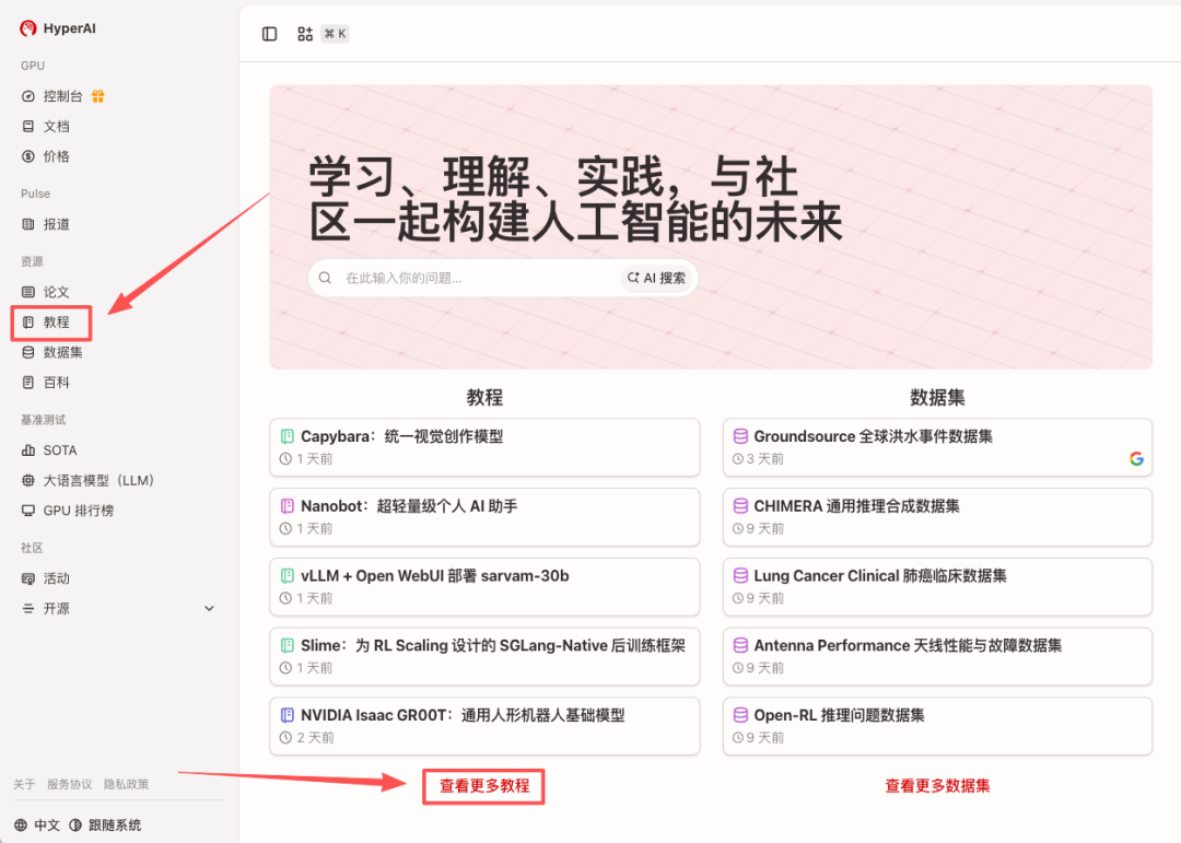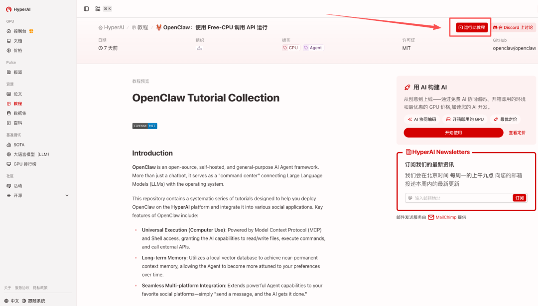 1.进入 hyper.ai 首页后,选择「教程」页面,或点击「查看更多教程」,选择「🦞 OpenClaw:使用 Free-CPU 调用 API 运行」,点击「在线运行此教程」。