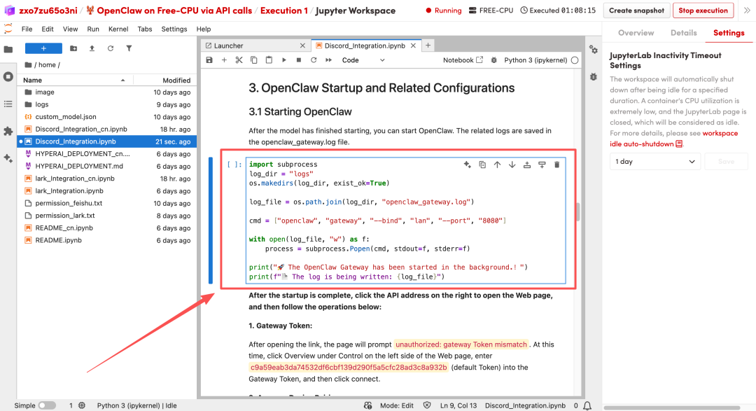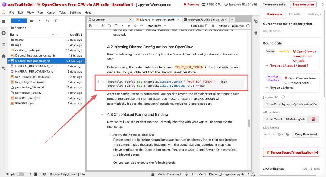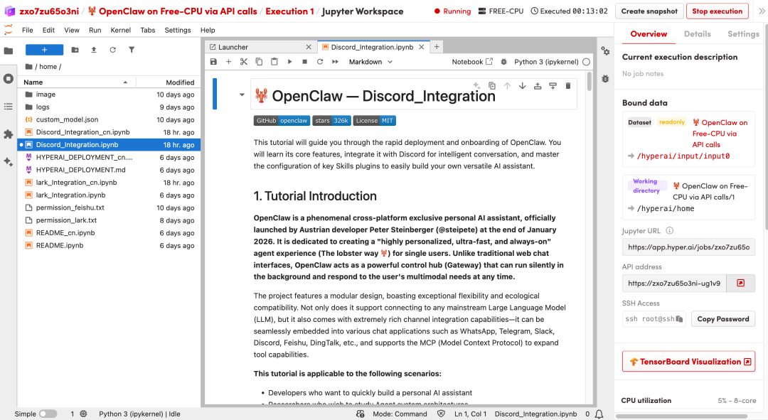 本教程以「🦞 OpenClaw:使用 Free-CPU 调用 API 运行」为例,详细介绍如何在 HyperAI 平台部署 OpenClaw,并接入 Discord。  OpenClaw 接入 Discord 效果展示 Demo 运行