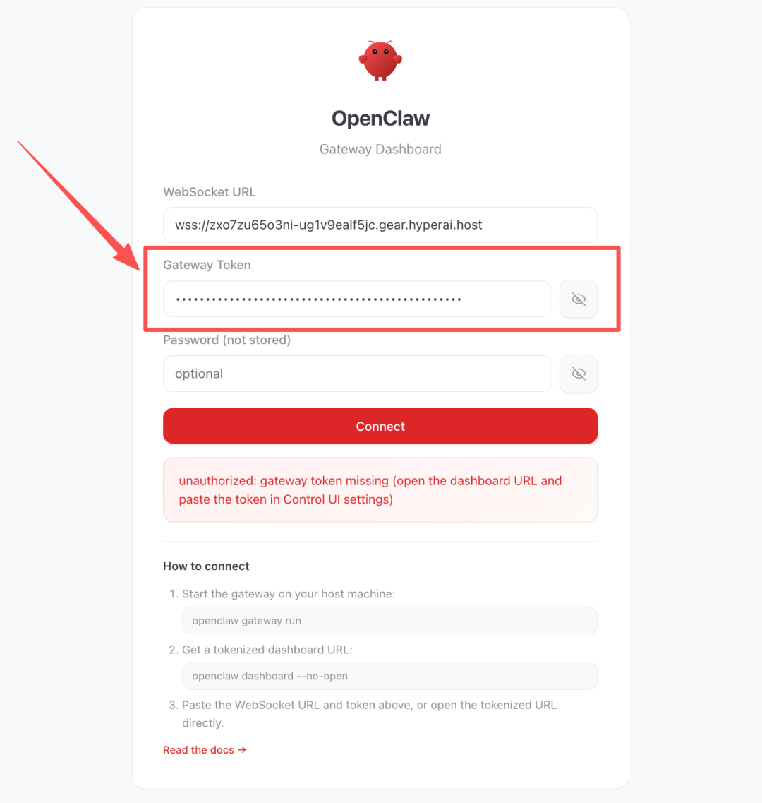 此时点击 Web 页面左侧中 Control 下的 Overview,将 c9a59eab3da74532df6cbf139d290f5a5cfc28ad3c8a932b (默认 Token) 输入到 Gateway Token 中,然后点击 connect。