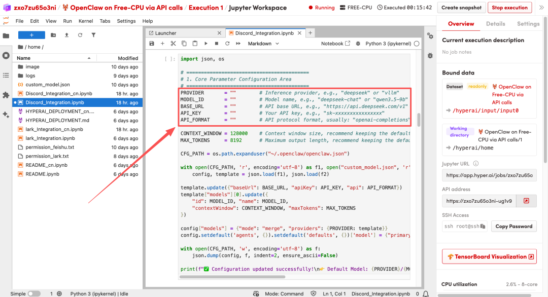 2.随后,指定调用的模型 API:在下方代码块的参数填入 API 信息并执行代码,脚本会自动完成与 openclaw.json 配置文件的合并与写入。