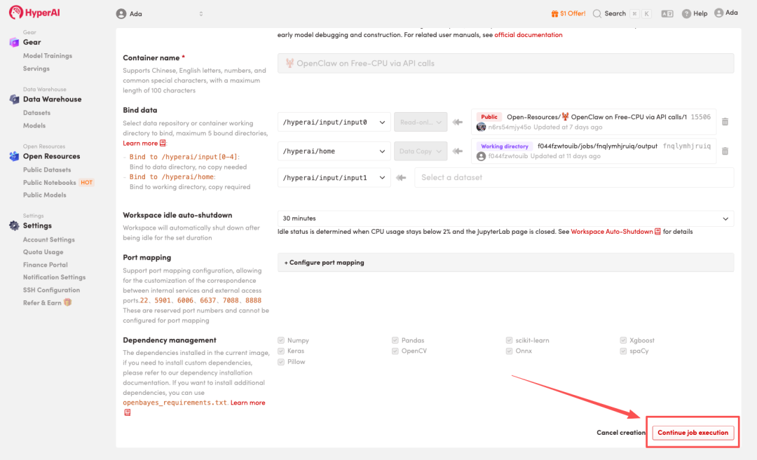 3.选择「Free-CPU」以及「openclaw」镜像,点击「Continue job execution(继续执行)」。
