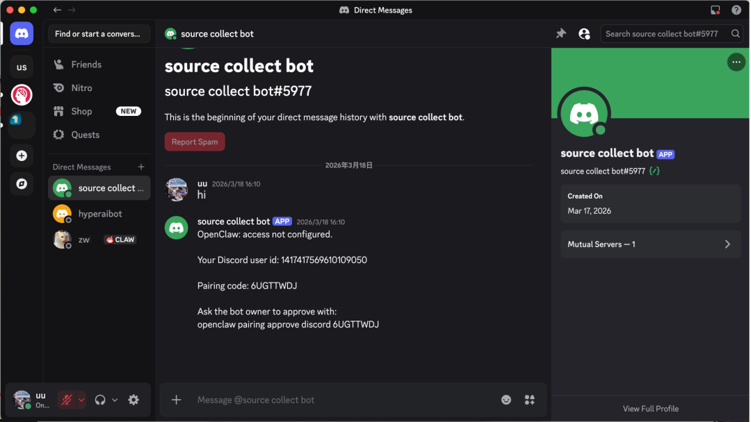 9.随后,返回 Discord 客户端接收配对码,在左侧私信列表中找到刚刚添加的机器人,给它发送任意一条消息。机器人会自动回复一个由字母或数字组成的配对码(Pairing Code)。再回到刚刚给 Agent 发送指令的聊天窗口,将收到的配对码直接发送给 Agent: 批准此 Discord 配对码:<你的配对码>。