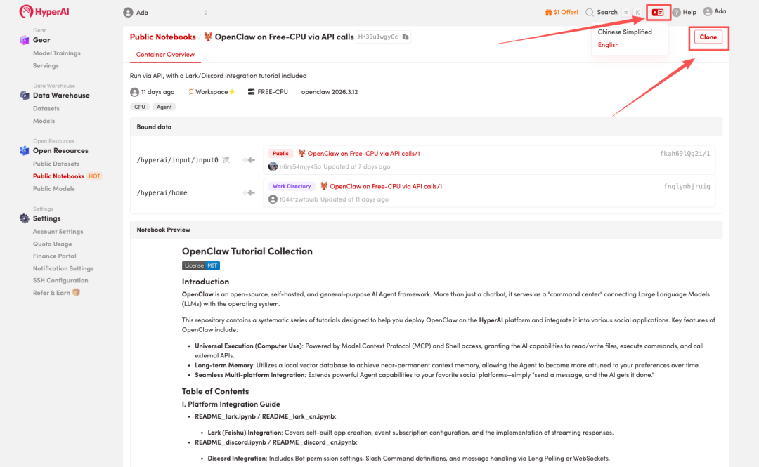 2.页面跳转后,点击右上角「Clone」,将该教程克隆至自己的容器中。 注:页面右上角支持切换语言,目前提供中文及英文两种语言,本教程文章以英文为例进行步骤展示。