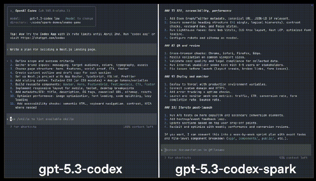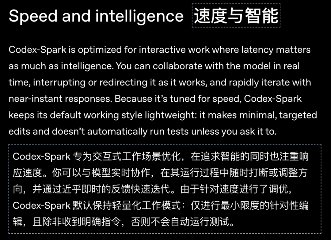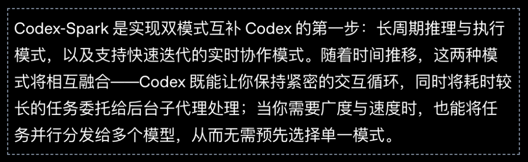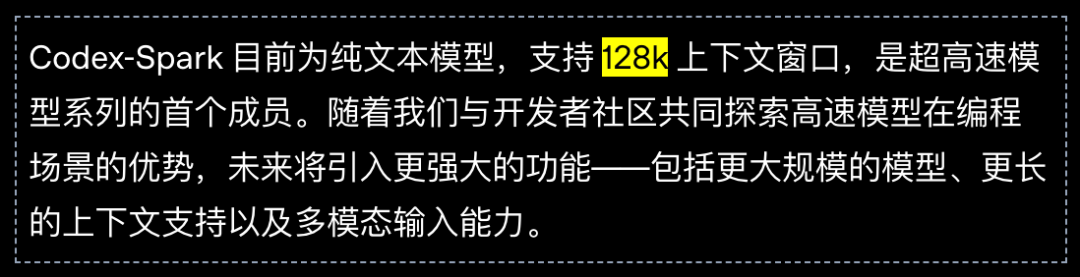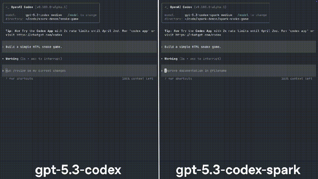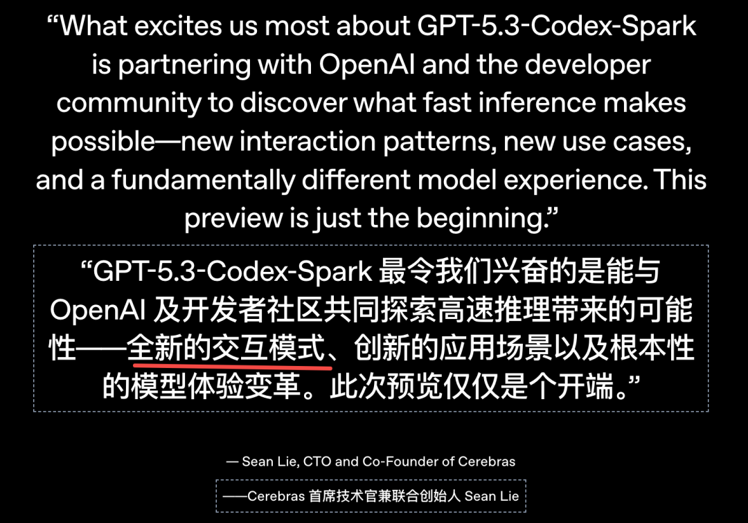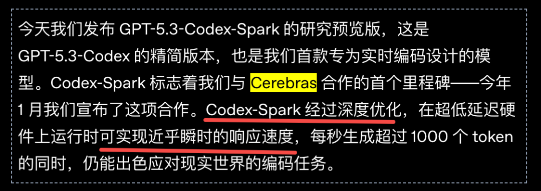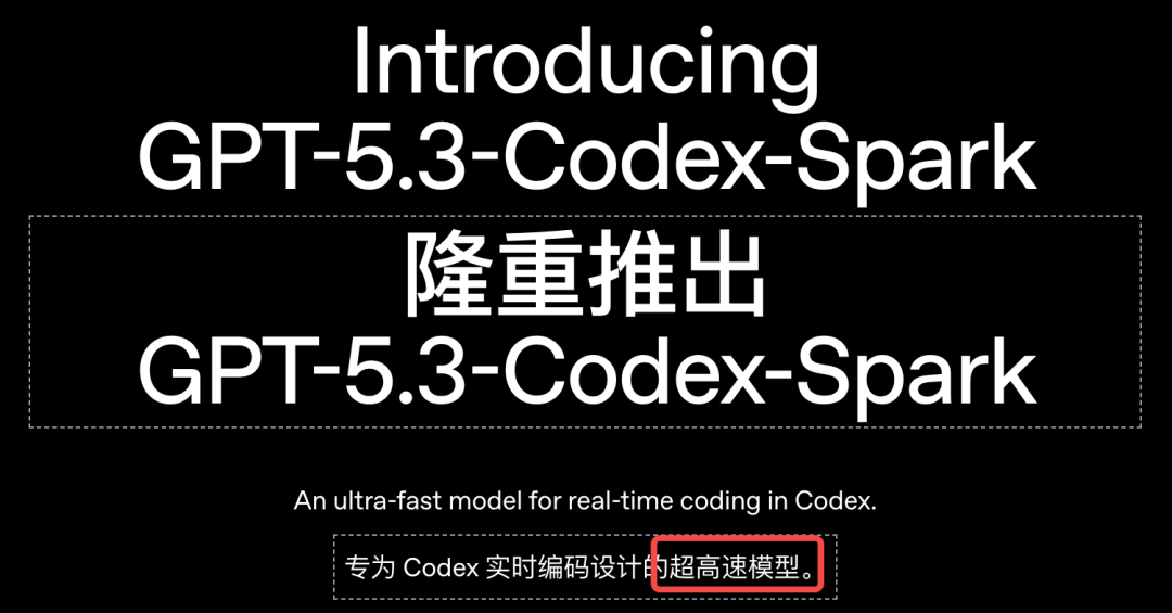 OpenAI又深夜炸场了。 GPT-5.3-Codex-Spark正式发布! 这次不讲大道理,只讲一个字:快。 到底有多快,看一下官方的演示: 它是GPT-5.3家族里的「闪电侠」。 也是OpenAI首个专为实时编程设计的模型,OpenAI称之为「超高速模型」。 大家写代码最烦什么?肯定是等待。 Spark的出现就是为了干掉等待。 它的生成速度超过每秒1000个token! 这是什么概念? 你刚敲完回车,代码已经写完了。 体感接近「瞬时响应」。 这次OpenAI找了个强力外援。 芯片巨头Cerebras。 Spark跑在Cerebras的Wafer Scale Engine 3上。  这不是普通的GPU堆叠。 这是专为低延迟设计的顶级硬件。 为了配合这股怪力,OpenAI还重写了底座。 他们引入了持久的WebSocket连接。 往返开销降低了80%。 首个字符出现的速度提升了50%。 模型虽然变「小」了,但脑子并没缩水。 在衡量程序员能力的各种榜单上。 Spark的表现依然强悍。 最关键的是,它完成任务的时间缩短了一大截。 在评估智能体软件工程能力的SWE-Bench Pro和Terminal-Bench 2.0两项基准测试中,GPT‑5.3‑Codex‑Spark展现出强劲性能,同时完成任务所需时间仅为GPT‑5.3‑Codex的一小部分。  以前模型写代码像在慢跑。 现在Spark是在跑百米冲刺。 它的应用场景很明确:实时协作。 你想改个逻辑,它立刻跟上。 你想重塑接口,它秒速完成。 你甚至可以一边看它写,一边随时打断它。 这种感觉不像是在用工具。 更像是在和一个手速极快的顶级极客结对编程。 配置方面也很有诚意。 128k的上下文窗口,目前仅支持文本。 安全标准也没落下,防御力依然在线。 现在ChatGPT Pro用户已经可以去尝鲜了。 无论是Codex App、CLI还是VS Code插件。 都能看到这个「火花」在跳动。 OpenAI的野心很明显。 未来的编程将分为两种模式。 一种是深度思考,模型自己干几天几夜。 一种是实时互动,模型和你火花四溅。 Spark就是开启第二种模式的钥匙。 人类敲代码的速度。 终于快要赶不上AI生成的进度了。