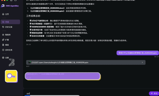 AI承诺的生产力革命,正被困在云端的围墙里。 你一定也遇到过这种尴尬: ChatGPT输出的答案逻辑满分,但面对你几百兆的本地数据库,它“罢工”了; Manus概念惊艳,但每一次上传、脱敏、同步,都在无形中消耗你的耐心。 更别提那些碰不得、不能传的敏感数据。 正因如此,我们更需要的,或许是一个深植于系统底层、无惧数据规模、且忠诚的“AI合伙人”,而非纯聊天搭子。 智能体的演进正在印证这一趋势——从OpenClaw(原ClawdBot/Moltbot)开始,AI从云端走向本地执行,但复杂的执行边界、权限控制与长期稳定性,依然是通用方案的“深水区”。 现在,那个填补空白的角色来了:XMO-AgentBox,一个本地智能体工作台。 带着“电力调度级”基因,要让AI在本地真正扎根它并非横空出世。其背后的杭州曦谋决策,是一家深耕电力能源行业、专攻大规模数学优化与时序预测的公司。 其掌舵人辛焱,曾穿梭于西门子、清华大学与阿里达摩院,有着10年以上电力行业算法与产品的实战积累。 从支撑省网级电力调度到领衔AI调度大赛,他们这支团队最擅长的,就是在极端复杂的环境下,解决最棘手的计算与安全问题。 现在,他们把这种“搞定复杂系统”的能力,封装进了XMO-AgentBox。 它不走云端的老路,直接在你的本地系统“扎根”。无需反复迁移数据,无需担心外流,更无需为模型配额焦虑。 它还在本地集成了最新发布的DeepSeek模型。 这意味着,你在守住数据主权的同时,AI的推理能力依然是“顶配”。 最新版DeepSeek的超长上下文能力,让模型第一次可以“读完全部”。但真正的冲击,是当它在XMO AgentBox中本地运行时—— 它理解的,不再是一段话,而是你的整个业务系统,从文件到数据,从历史决策到未来预测,全部成为一个完整上下文,AI开始真正拥有“全局认知”。 一个能听懂目标、并自动交付结果的伙伴,这不就来了。 从一键生成发布会级PPT,到撰写专业标书,再到创意视频生成,XMO-AgentBox的表现如何? 三个标杆场景具体拆解如下: 标杆场景解读:从想法到专业成果智能PPT一键生成痛点:手动排版耗时耗力,模板僵化,逻辑呈现与视觉设计割裂。 解法:只需输入主题、核心论点或大纲,XMO-AgentBox便能理解意图,自动生成结构完整、逻辑清晰的PPT。  不仅仅是填充页面,它还能根据内容层级,智能匹配版面设计、图表建议,输出一份发布会级水准的演示文稿草稿, 格式与设计的重担交由AI完成,你能够把精力都聚焦在内容的打磨与故事的讲述上。 专业标书/长文档撰写与处理痛点:对于文档篇幅巨大、结构固定、重复性强的内容,例如标书(指由发标单位或委托设计单位编制的法律文件)、科研报告等,撰写与合规性检查的工作如同“人力苦役”。 解法:XMO-AgentBox能够阅读和分析你提供的既往文档与资料库,依据新的招标要求,自动生成符合规范的结构、填充内容、进行一致性检查,并快速整合多源信息。  它将专家从信息“搬运工”的角色中解放了出来,让其转向更具价值的方案设计与策略优化上。 创意彩蛋:一句话,让公司吉祥物向你拜年除了应对严肃的专业挑战,XMO-AgentBox同样能轻松创造趣味内容。 例如,在新春之际,你可以直接对它说:“基于我们公司的小陨石吉祥物,生成一段拜年视频,要有科技感。” 它能快速理解你的创意,结合节日元素与品牌形象,自动生成一段充满个性的贺岁视频。 这不仅是能力的展示,更预示着一种全新的、高度个性化的内容创作可能。 不止于案例:一个扎根本地的智能体工作台需要强调的是,上述三个场景只是XMO AgentBox能力的缩影。 它的本质,是一个可扎根于本地系统运行的通用智能体工作台。 1、平台化能力它原生支持各类办公与专业软件,可处理百万行级Excel数据、自动生成流程图、进行优化排班决策等。 其设计初衷,是让用户通过自然语言,驱动一个真正理解目标、并能规划步骤去执行的智能体。 2、核心价值全闭环的数据主权(一切计算在本地完成);