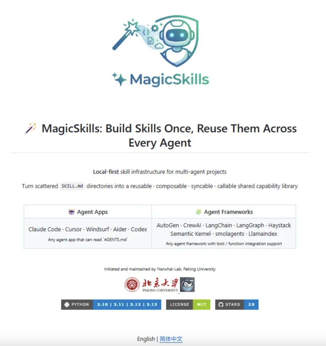 AI Agent世界的npm来了! 最近,北京大学Narwhal-Lab的开源项目MagicSkills,通过把AI Agent所需的技能(Skill)统一管理、安装、组合和同步,实现了“写一次、到处用”的能力复用,让AI Agent世界终于有了类似npm的角色。  不过,MagicSkills不是管理JavaScript包,而是管理Agent所依赖的Skill: 把分散在不同项目里的Skill整理成一套可以安装、管理、组合、同步和调用的共享能力层。 当Agent的能力越来越多、复用需求越来越强时,Agent世界也开始需要一个类似npm这样的角色,去管理这些Skills。 这是怎么做到的? 把agent的skill管起来!在实际开发中,很多人都遇到过同样的问题:第一个Agent写了一堆技能,比如PDF处理、搜索、Git操作、Docker控制、文档处理或代码相关能力,项目里大概结构是agent/skills下各个skill文件夹。  但第二个、第三个Agent又会复制一份技能,时间一长就会发现重复实现、管理混乱、复用难、易分叉,一旦接入方式变了,又得重新整理。 这种状况类似早期软件开发还没有npm或pip的时代,不同类型的Agent框架和应用之间同样存在重复接入的情况。 - 在Claude Code、Cursor、Windsurf、Aider、Codex这类Agent应用 里,你可能会把同一套skill复制到多个agent的工作目录里。